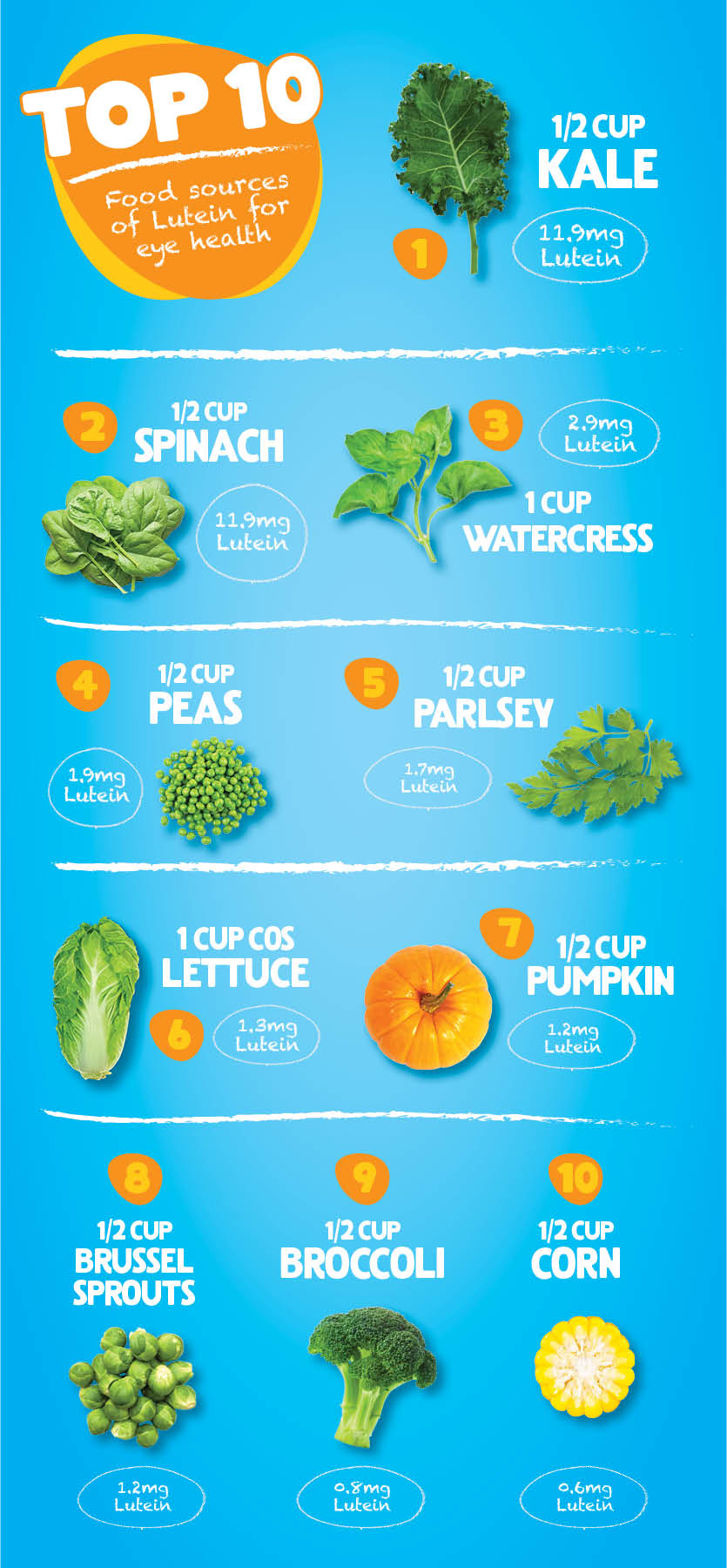 Think of any colourful fruit or vegetable and there’s a good chance it will supply some amount of lutein. The table below shows some of the best food sources of lutein recommended by the Australian Macular Degeneration Foundation. While there is no standard dietary guideline on how much lutein we should consume each day, the Australian Macular Degeneration Foundation suggest 6 mg is a healthy amount.