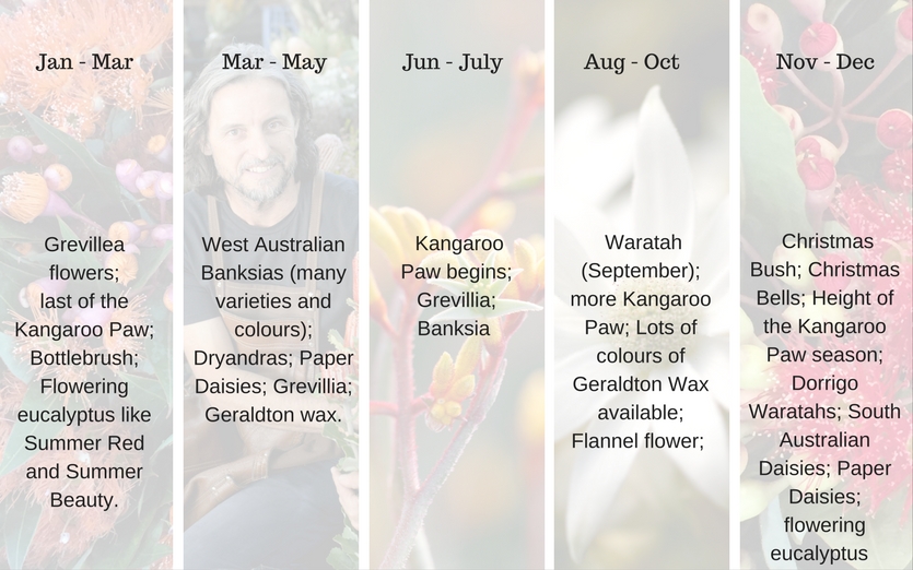 There are so many colours and styles of native flowers to work with throughout the year. This guide from East Coast Wildflowers gives you some general rules about what is best throughout the year.