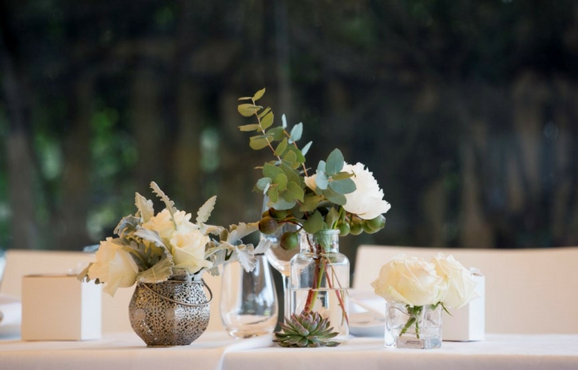 The look is made all the more interesting by teaming the hardy green of the succulent with mixing metal and glass vessels in different shapes and sizes, like that pictured by event stylist Amelia Johnson, owner of Bespoke Social. Amelia has strategically placed succulents among vases of large open peonies with native gum, white roses and dusty miller to give this romantic setting a modern edge.