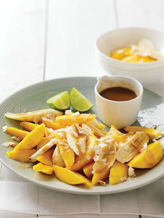 STEP 2 To serve, cut cheeks from mangoes, remove skin and thickly slice. Peel and diagonally slice bananas. Arrange fruit on a serving platter or plates. Drizzle with sauce and serve with lime wedges.