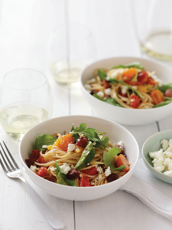 STEP 3 Drain spaghetti and return to the pan. Add tomato mixture, chorizo, rocket, feta, olives and extra virgin olive oil. Season with pepper to taste. Toss over low heat until hot and well combined and serve.