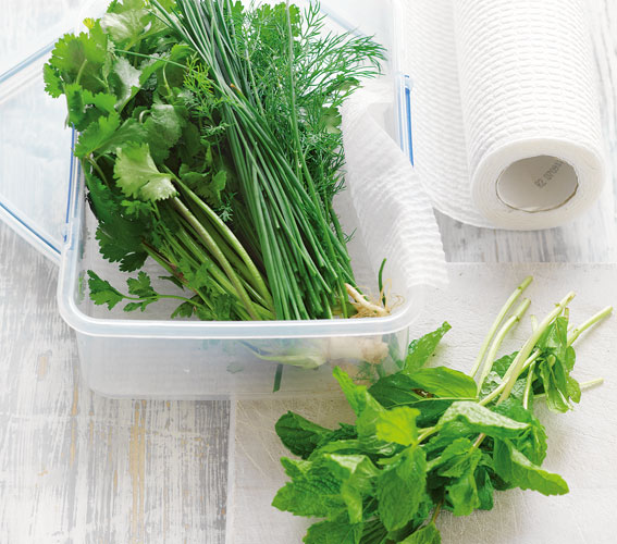 - Loosen bunches and place the unwashed herbs in an air-tight plastic container lined with damp paper towel. Ensure the herbs are not too cramped.