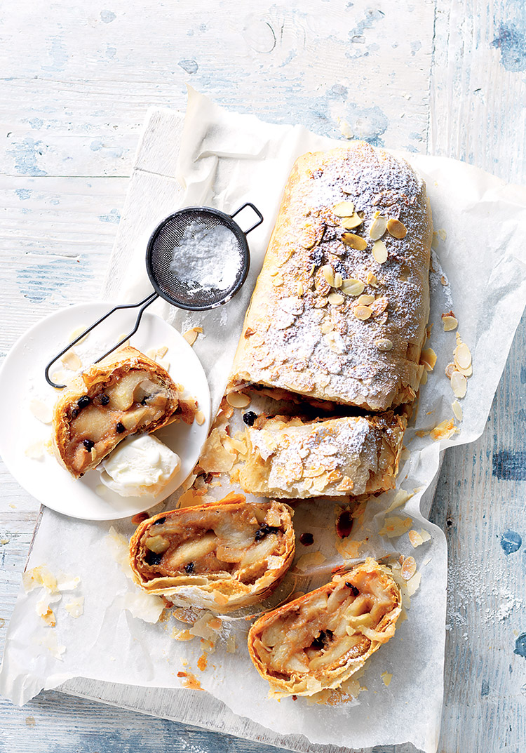 Step 4 With the long edge of the pastry closest to you spoon apple mixture along the length of the filo, leaving a 5 cm border on the sides and the edge closest to you. Sprinkle almonds over apple. Fold in sides of filo and the side closest to you, then firmly roll up pastry to form a log. Place, seam-side down, onto the prepared baking tray. Brush with butter and sprinkle with the extra 2 tbs almonds. Bake for 15 minutes. Reduce heat to 180°C/160°C fan-forced and bake for a further 20-25 minutes until golden. Serve hot or cold with ice-cream.