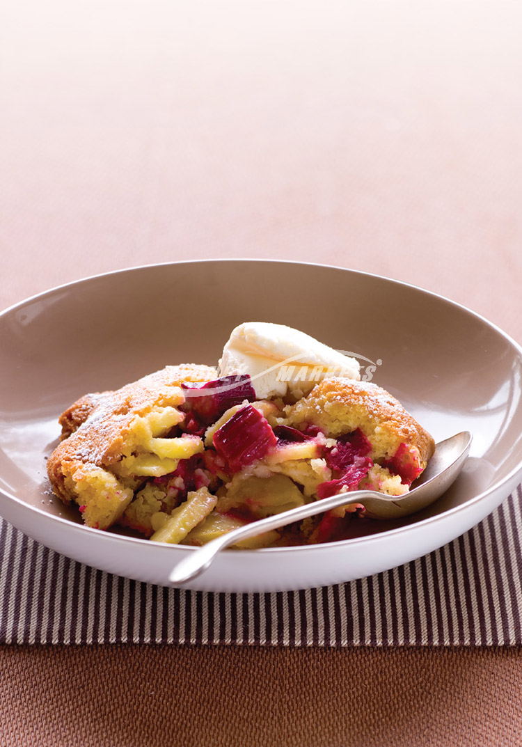 Step 3 Sift flour and baking powder over mixture. Using a large metal spoon, gently fold mixture until combined. Spoon batter over apples and rhubarb and gently smooth top. Bake for 50–55 minutes (cover loosely with a sheet of foil when top is golden) or until sponge is cooked through. Stand for 10 minutes. Dust with icing sugar and serve with ice-cream.