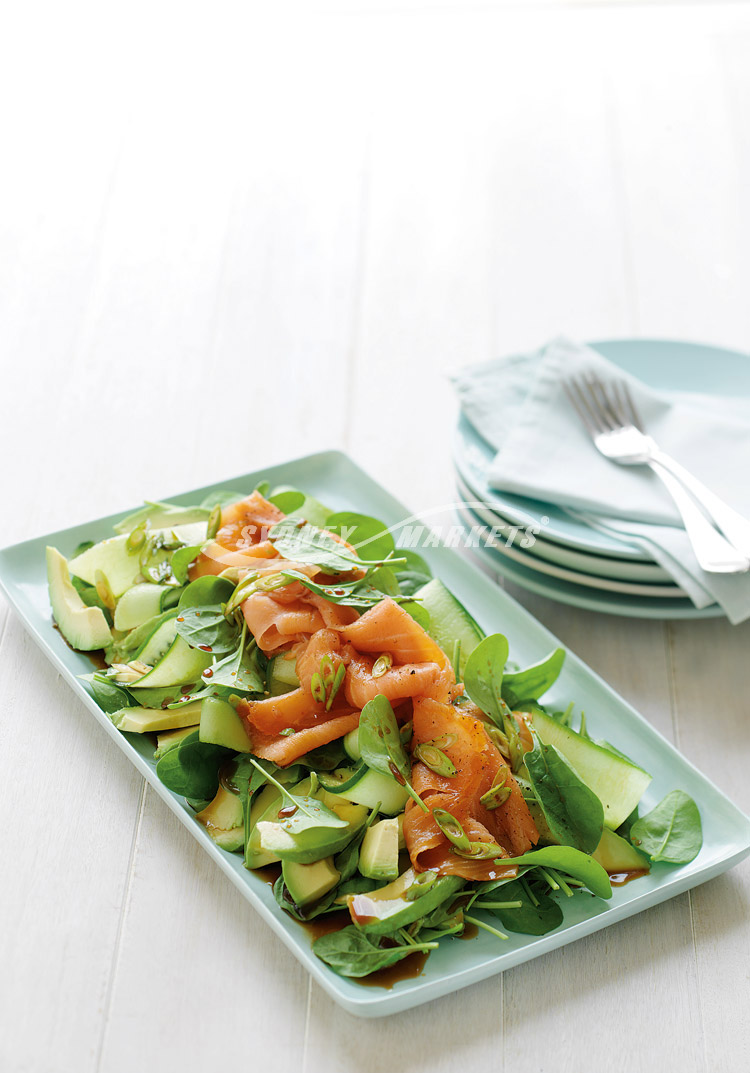 Step 2 Arrange spinach leaves, avocados, cucumbers and smoked salmon on a serving platter or serving plates. Drizzle with sweet soy dressing and serve.