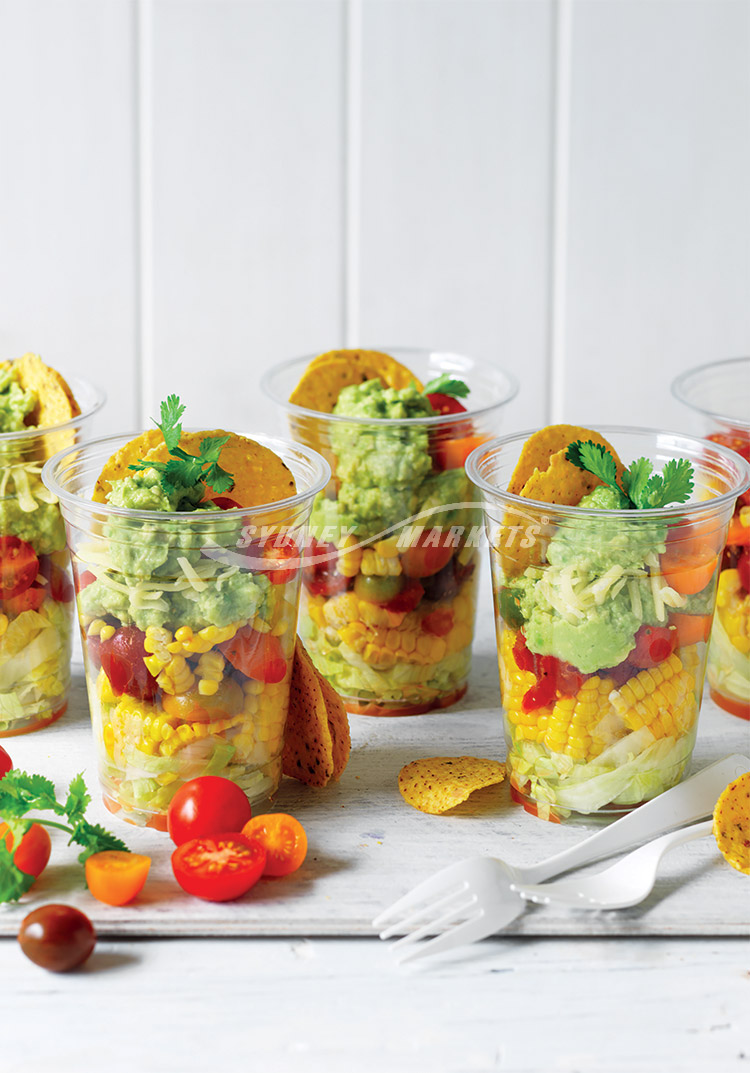 Step 3 To assemble the salads, layer the lettuce, sweetcorn, tomato mixture and avocado into serving cups. Top each with a coriander leaf and serve with corn chips.