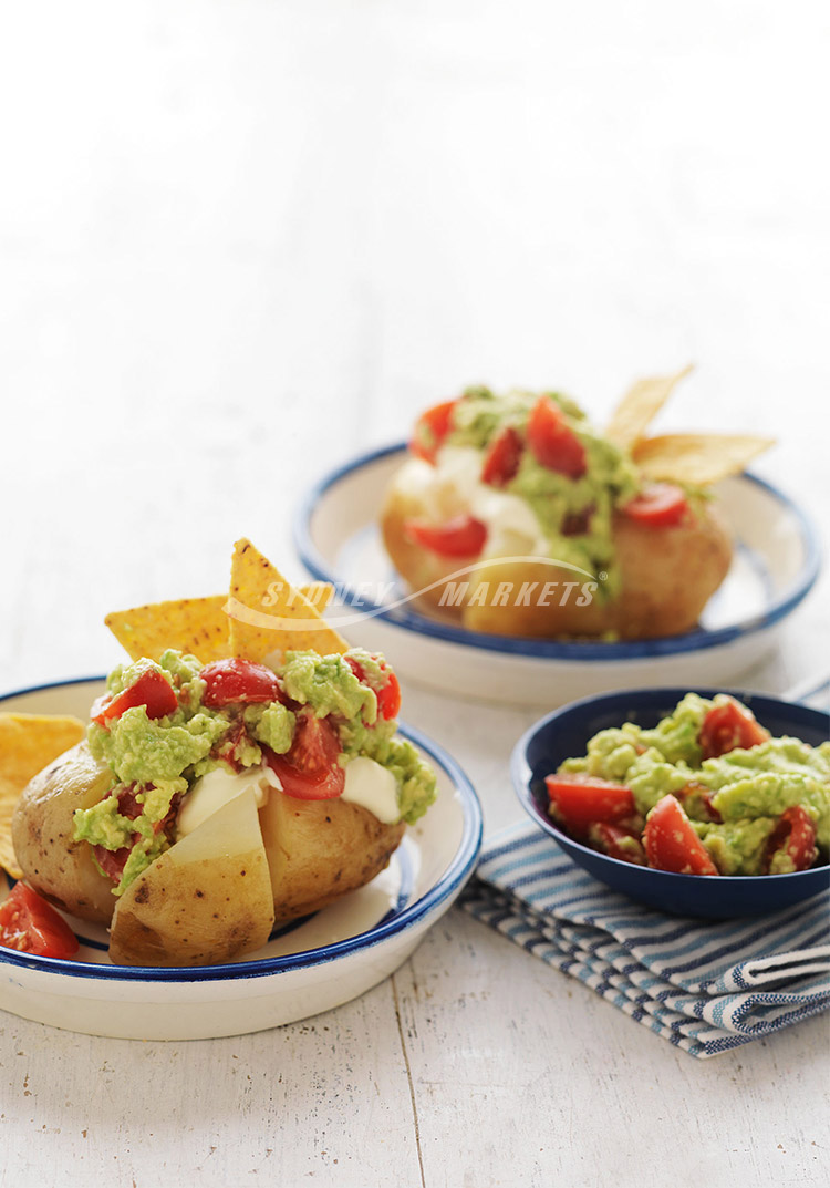 STEP 1 Preheat oven to 180°C/160°C fan-forced. Wash potatoes and pat dry. Using a fork, pierce each potato all over 8-10 times. Wrap each potato in foil and place onto a baking tray. Bake for 1 hour or until just tender when tested with a skewer. Remove from oven, open foil and set aside to cool slightly.