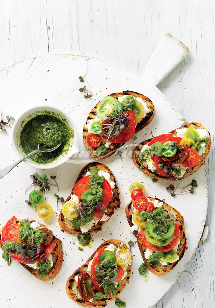 - Basil, spinach & olive pesto, ricotta & tomato bruschetta