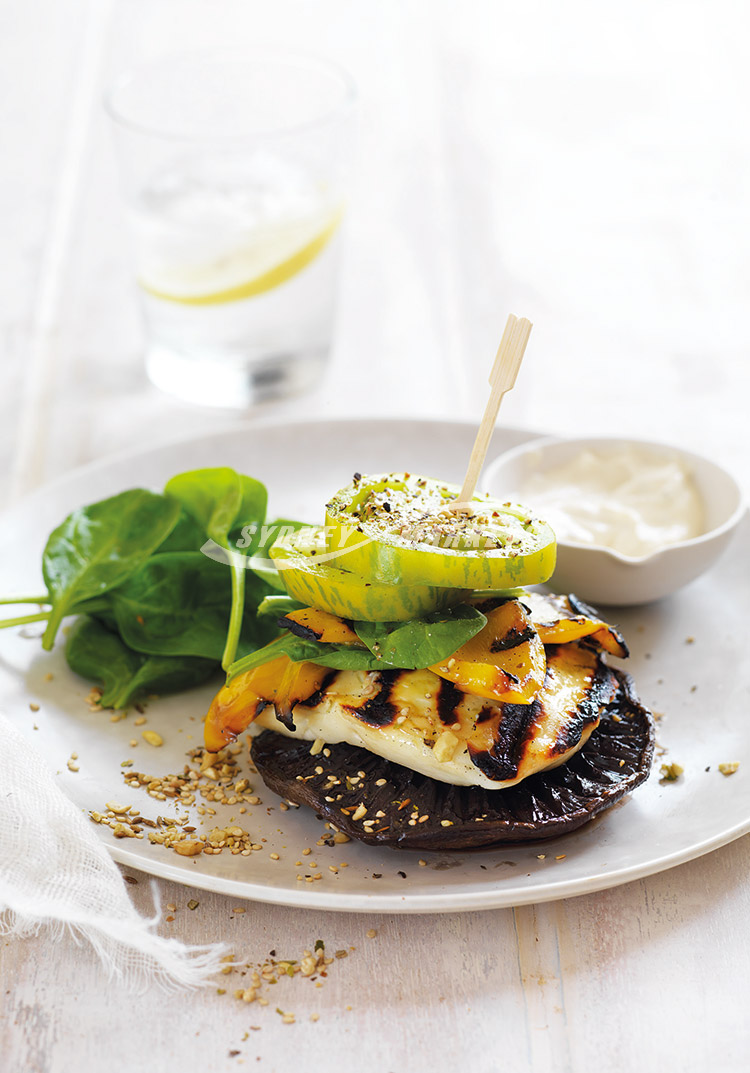 Step 3 To serve, top each mushroom with haloumi, capsicum and tomatoes. Serve with spinach leaves, yoghurt & tahini dressing and dukkah, if using.
