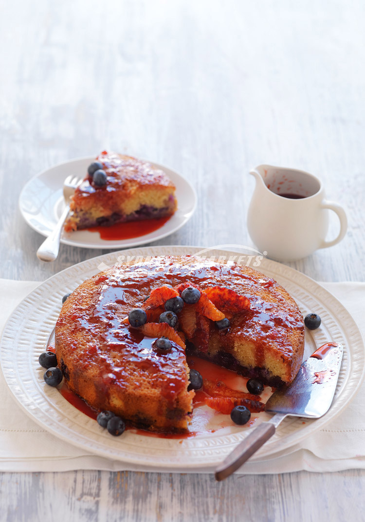 Step 5 Place warm cake onto a serving plate. Gently prick cake using a fine skewer and slowly pour warm syrup over cake. Spoon blood orange segments and blueberries in the centre, slice and serve.