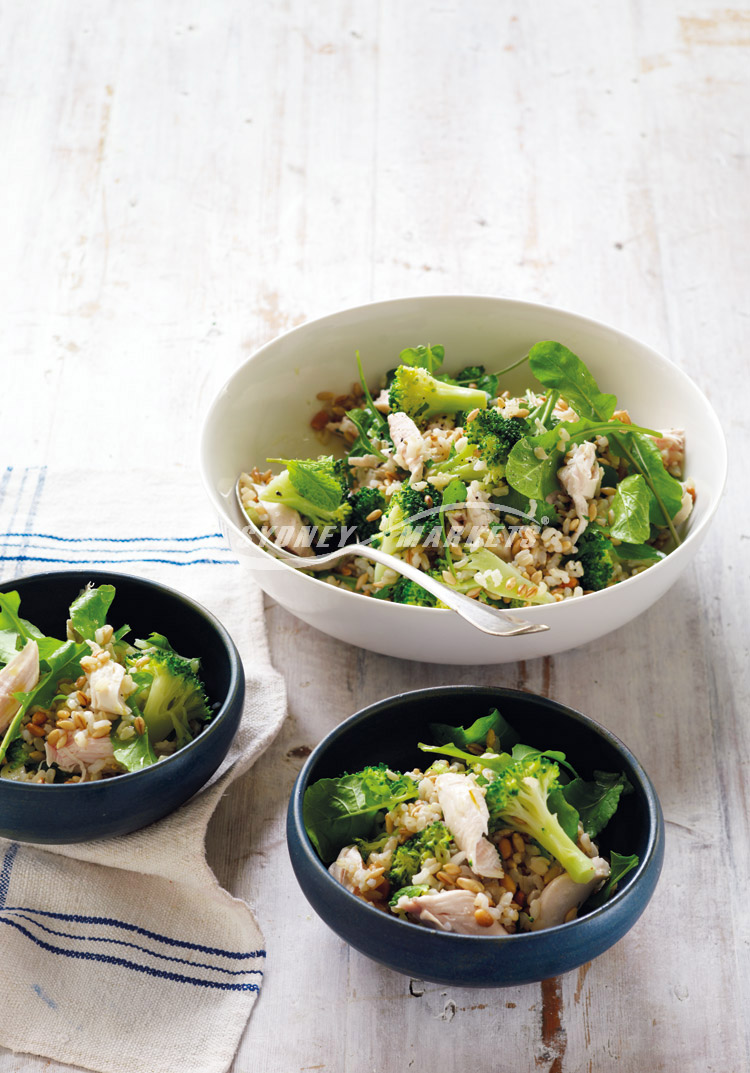 Step 3 Add chicken, broccoli, rocket, mint, green onions, lemon juice, oil and pine nuts to the rice. Season with salt and pepper to taste. Gently toss to combine and serve.