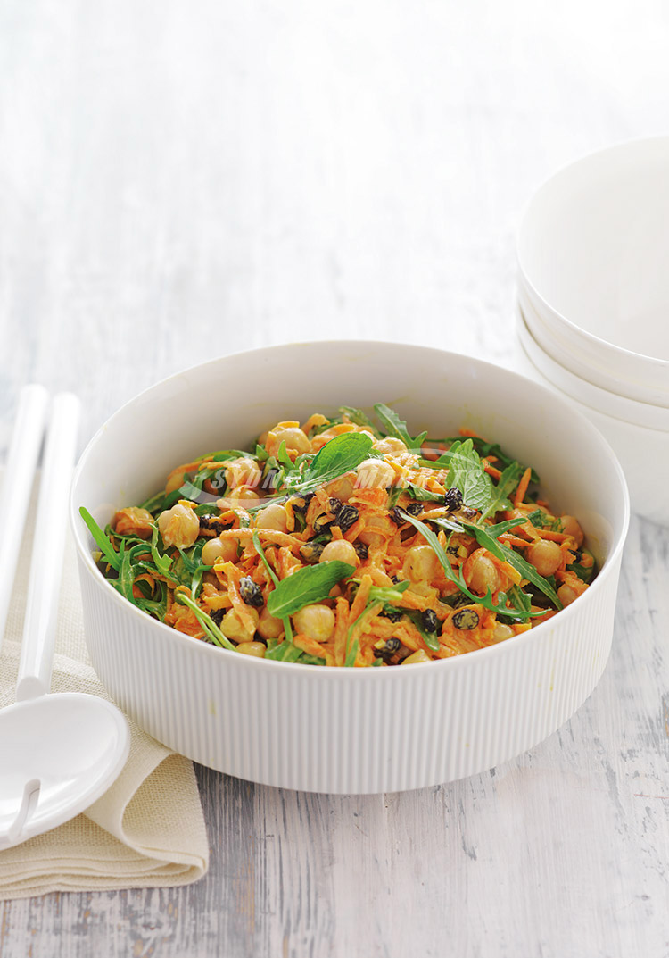 Step 2 Meanwhile, peel, shred or coarsely grate carrots. Place carrots and chickpeas into a large bowl. Combine yoghurt, tahini and orange juice in a bowl. Whisk until well combined. Drizzle yoghurt mixture over carrot mixture. Season with salt and pepper. Gently toss until well combined. Toss through rocket leaves and serve.