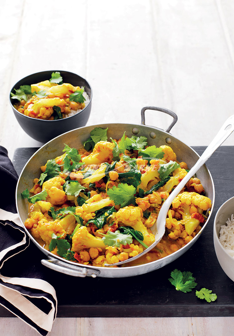 Step 2 Add tomatoes and cook, stirring often, until softened. Bring to the boil. Reduce heat, cover and simmer for 5 minutes. Add cauliflower, chickpeas and stock. Cover and simmer for 15-20 minutes or until cauliflower is just tender.
