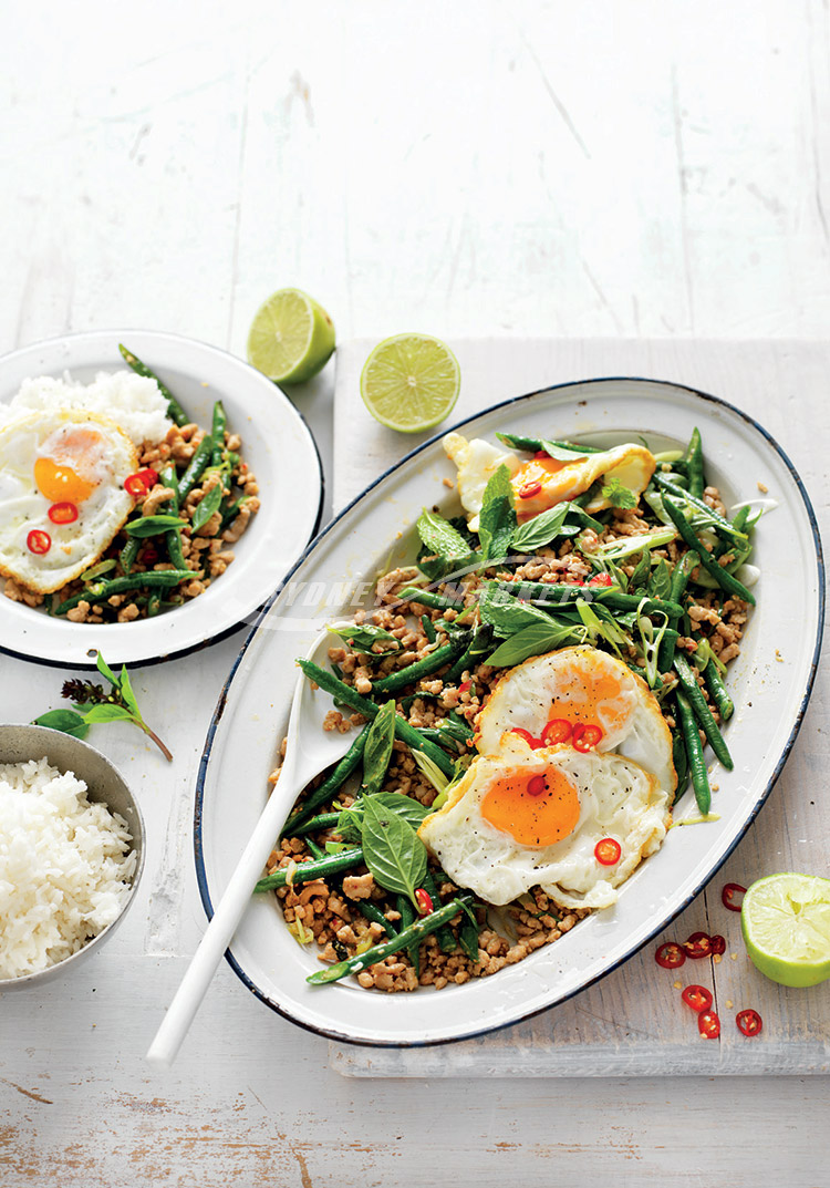Step 3 Toss through green onions and beans. Stir-fry for 2-3 minutes until vibrant. Toss through Thai basil and mint. Serve with eggs, steamed jasmine rice, lime wedges and extra sliced chilli.