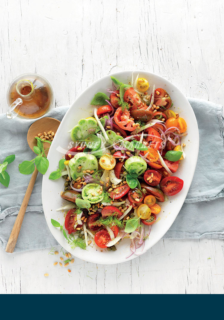 Step 2 Slice larger tomatoes and halve smaller tomatoes. Add tomatoes to the onion. Add fennel and capers. Drizzle with oil and vinegar. Season with pepper. Toss through basil and pine nuts and serve.