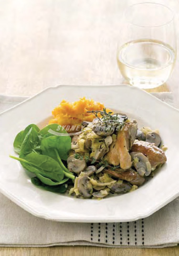 Step 3 Add chicken, stock and lemon juice to pan. Partially cover and simmer, turning chicken occasionally, over low heat for 20 minutes. Stir through cream and season with salt and pepper to taste. Simmer for 5 minutes. Serve with baby spinach leaves and mashed butternut pumpkin.