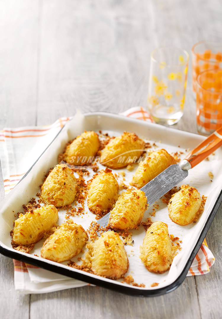 Step 1 Preheat oven to 180°C/160°C fan-forced. Peel potatoes and halve lengthways. Place a halved potato cut-side down onto a board. Slice thin, evenly–spaced cuts, about two thirds of the way through potato. Repeat using remaining potatoes. Liberally spray potatoes with oil and place cut-side down onto a baking tray lined with baking paper. Bake for 50-55 minutes until tender.