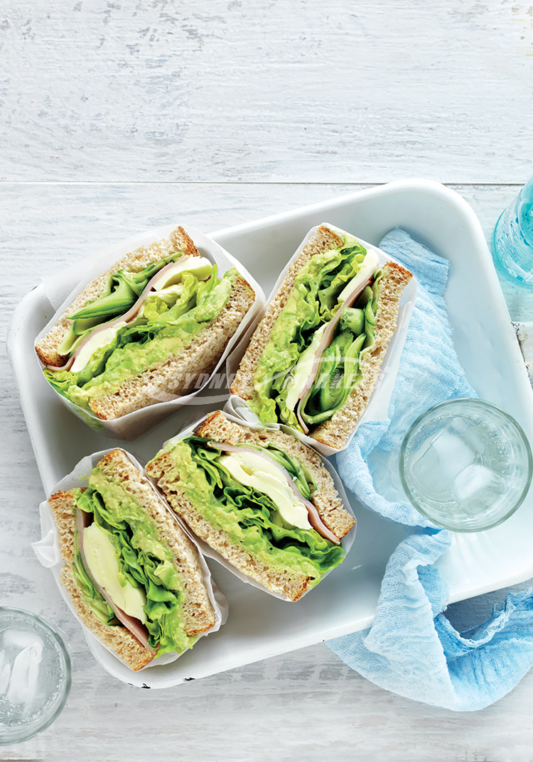 Step 2 Place 2 slices bread onto a board. Spread with avocado then top with lettuce, mozzarella, ham and cucumber. Lightly spread remaining bread with butter or margarine. Top sandwiches with the bread. Cut in half and serve.