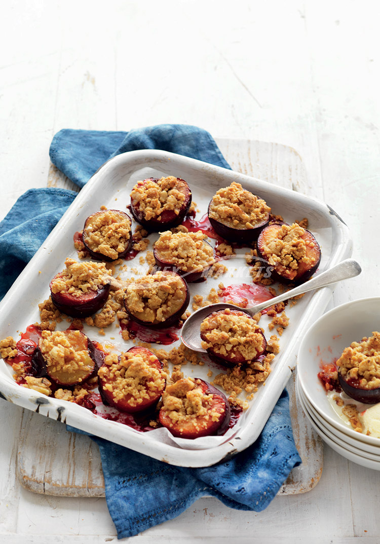 Step 2 Combine flour and sugar in a bowl. Using your fingertips, rub in butter until well combined. Stir through walnuts. Top plums with crumble mixture. Bake for 15-20 minutes until plums are tender and crumble is golden. Serve with vanilla ice-cream or yoghurt.