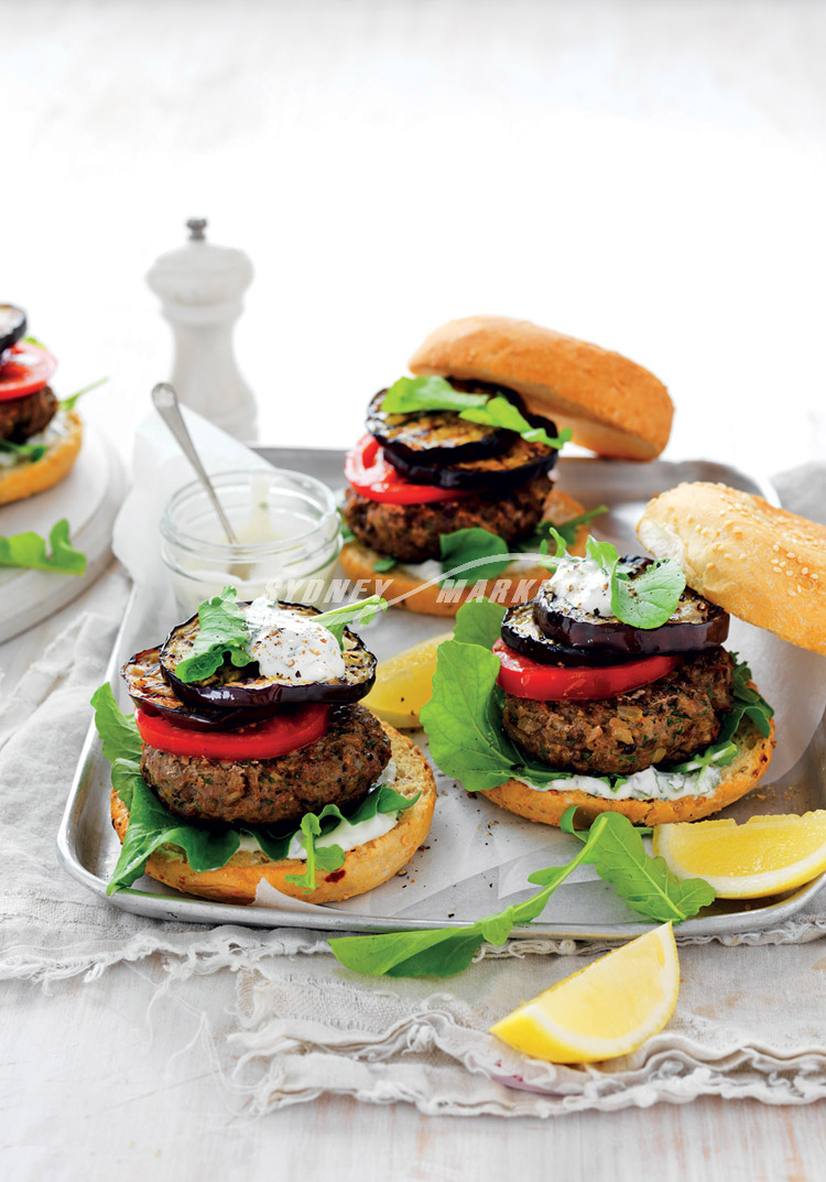 Step 3 Place bread roll bases onto a board. Top each with a dollop of tzatziki, rocket, a pattie, sliced tomato and eggplant, finishing with another dollop of tzatziki. Add roll tops and serve.
