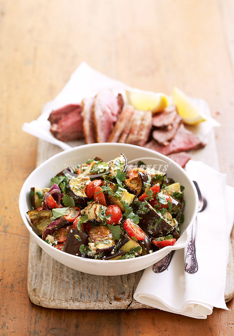 Step 2 Place cooled eggplant mixture, tomatoes, coriander, mint and feta into a bowl. Drizzle with oil and season with salt and pepper to taste. Toss to combine and serve.