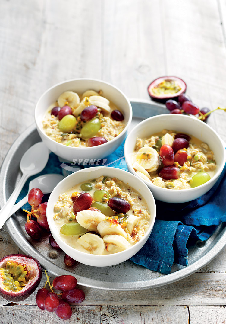 Step 2 To serve, coarsely grate apple. Add apple, yoghurt and the pulp from 2 passionfruit to the muesli mixture. Stir to combine. Spoon into serving bowls. Top with grapes, banana and remaining passionfruit pulp. Drizzle with honey and serve.