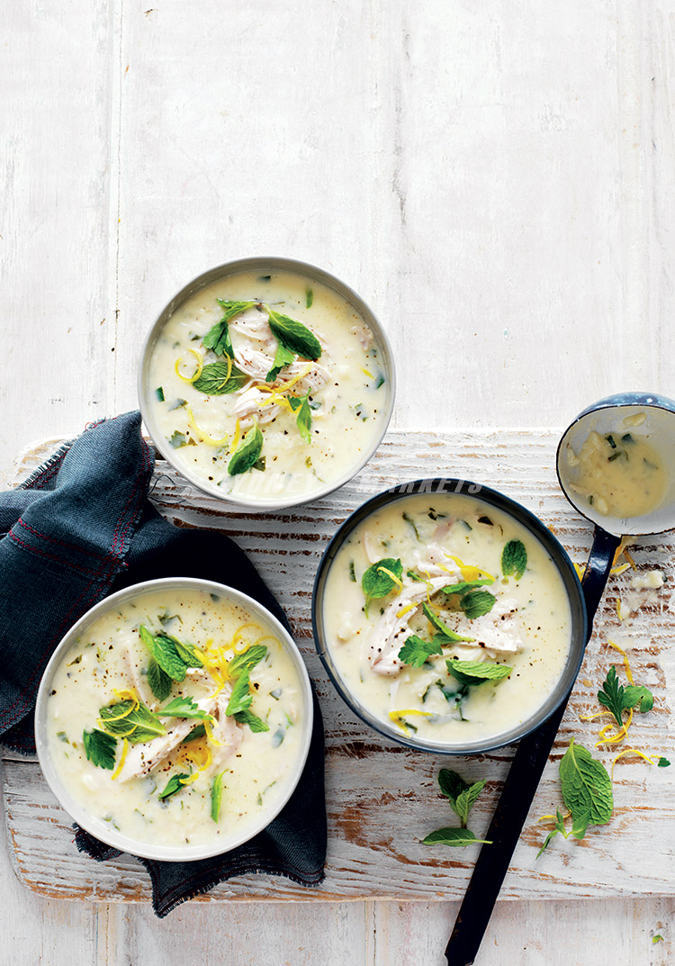 Step 3 Whisk eggs in a medium bowl then gradually whisk in lemon juice. Gradually whisk 1 cup of the hot chicken and rice stock into egg and lemon mixture. Then whisk egg mixture into the hot stock left in the pan. Gently simmer over low heat until thickened (do not allow to boil). Stir in chicken, parsley and mint. Season well with salt and pepper and serve. Scatter with lemon zest and a few extra mint and parsley leaves if liked.