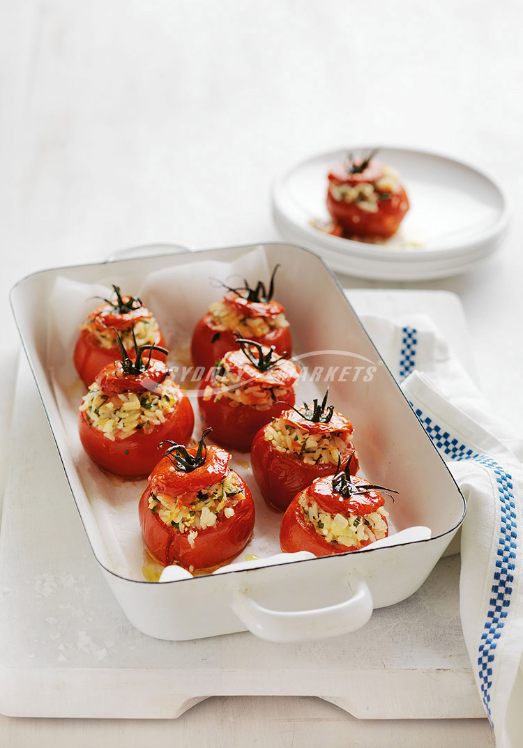 Step 3 Evenly spoon rice mixture into tomatoes. Arrange tomatoes in a large baking pan lined with baking paper. Place reserved tops on tomatoes. Spray with oil and bake for 45-50 minutes until tender. Serve warm or at room temperature.