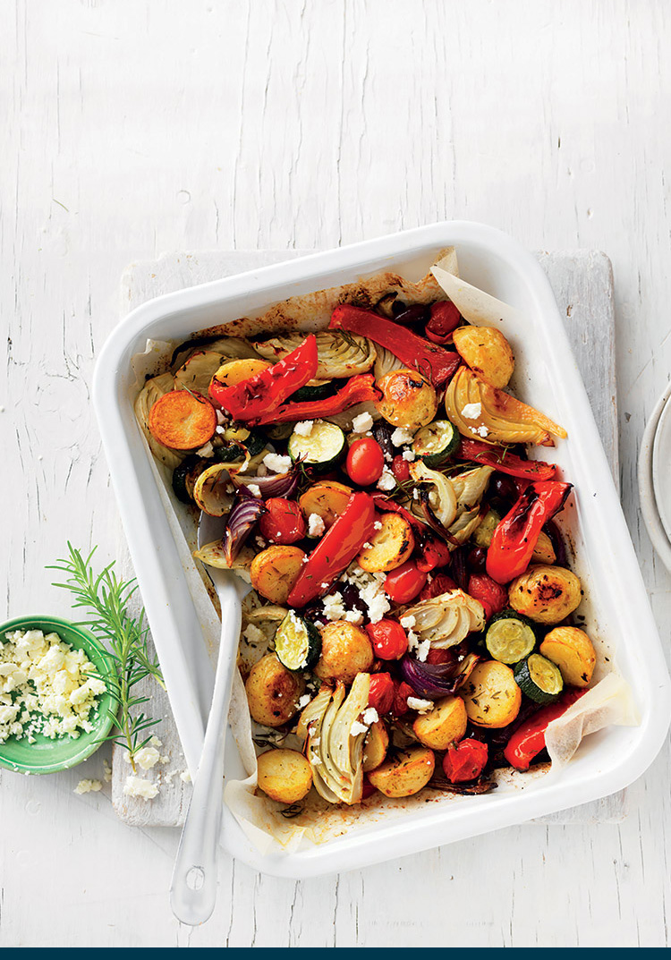 Step 4 Toss tomatoes and olives through the vegetables and roast for a further 10 minutes or until tomatoes are tender. Drizzle with extra virgin olive oil. Sprinkle with feta and serve.