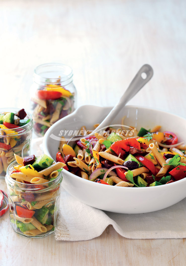 - Grilled capsicum, tomato & chorizo pasta salad