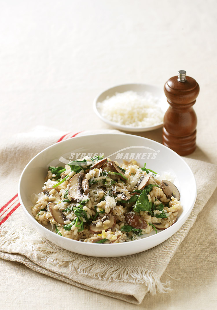 Step 3 Gradually add small ladlefuls of boiling stock to the rice, stirring constantly (this takes about 15 minutes). Stir in mushrooms with the last ladleful of stock. Stir to combine (at this point rice should be just tender and creamy, if not add extra stock). Stir in spinach. Remove from heat, stir in parmesan and season with salt and pepper to taste. Serve with extra grated parmesan cheese.
