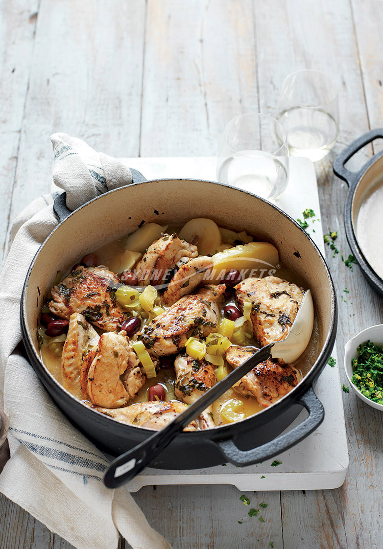 STEP 3 Grease a large oven-proof casserole pan with oil. Arrange potatoes, celery and leeks in pan. Add wine, stock and half the parsley. Arrange chicken in pan and pour over any remaining pan juices. Cover (with a lid or foil) and bake for 1 hour to 1 hour 15 minutes until chicken is tender. Stir through olives and the remaining parsley in the last 5 minutes of cooking. Sprinkle with gremolata or parsley to serve.
