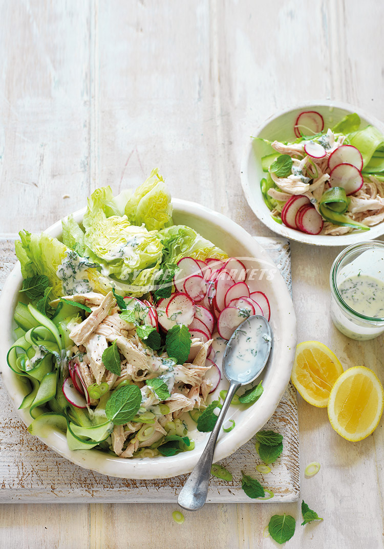 Step 3 Using a vegetable peeler cut cucumbers lengthways into thin ribbons and discard seed core. Arrange cucumbers, lettuce, green onions, radishes and chicken on a serving platter or plates. Drizzle with dressing. Scatter with mint leaves and serve with lemon wedges.