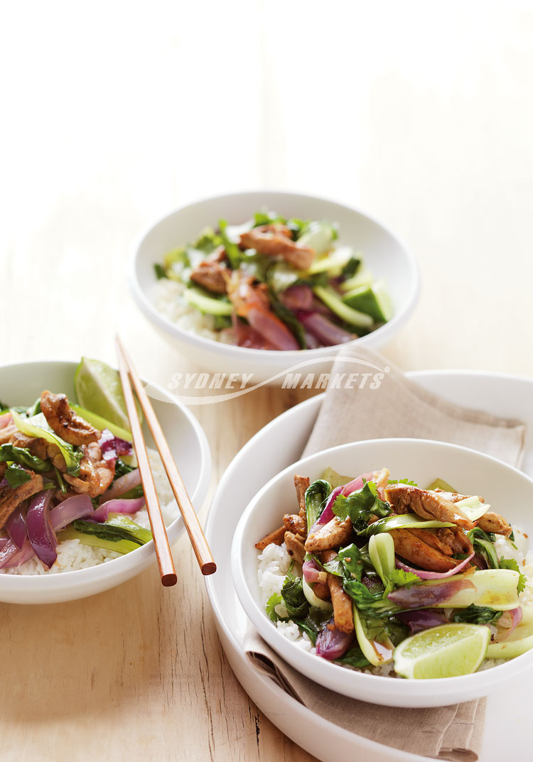Step 3 Add remaining 1 tbs oil and onions to wok. Stir-fry over high heat for 1 minute. Add bok choy and dipping or sweet chilli sauce. Stir-fry for 1 minute. Add chicken and stir-fry for 2 minutes. Toss through coriander and serve with steamed jasmine rice.