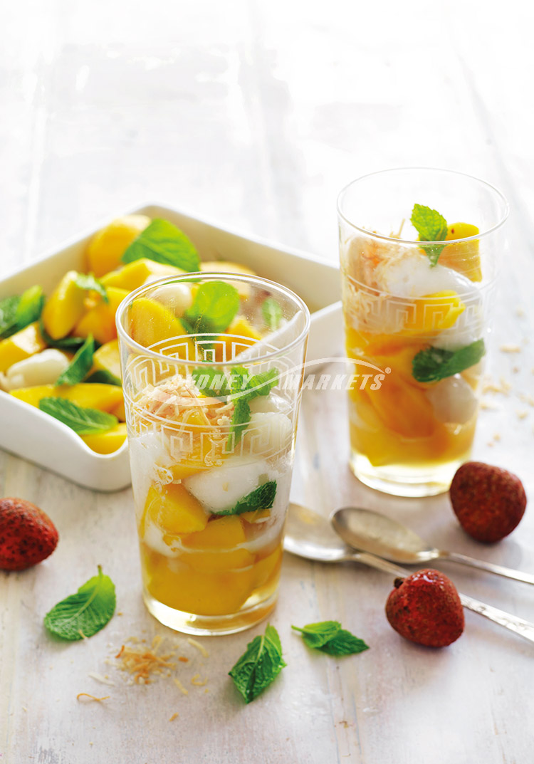 Step 2 To serve, peel mangoes and cut flesh into thick slices. Combine mangoes and lychees in a bowl. Pour over lime syrup and scatter with mint. Spoon fruit mixture and scoops of sorbet into serving glasses, sprinkle with toasted coconut and serve.