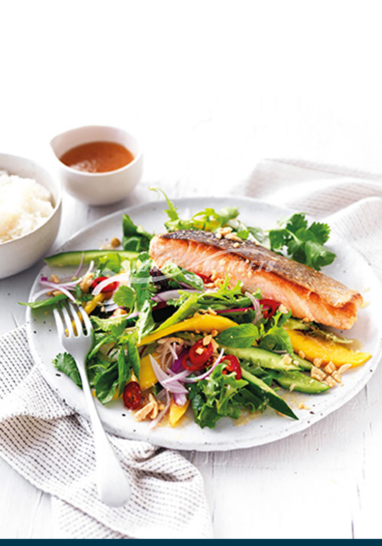 Step 5 Drizzle mango, herb & chilli salad with the dressing and gently toss to combine. Arrange salad on serving plates. Top each with a piece of salmon. Sprinkle with peanuts and serve with steamed jasmine rice.