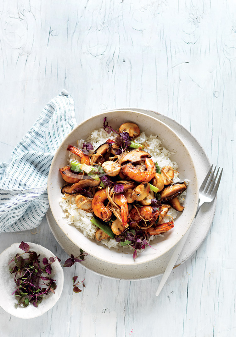 Step 3 Add remaining 1 tbs oil, green onions, garlic and shiitake and button mushrooms to wok. Stir-fry for 2 minutes until just tender. Add reserved marinade and return prawns to wok. Stir-fry until hot and bubbling. Toss through enoki mushrooms. Scatter with micro-herbs. Serve with steamed jasmine rice.