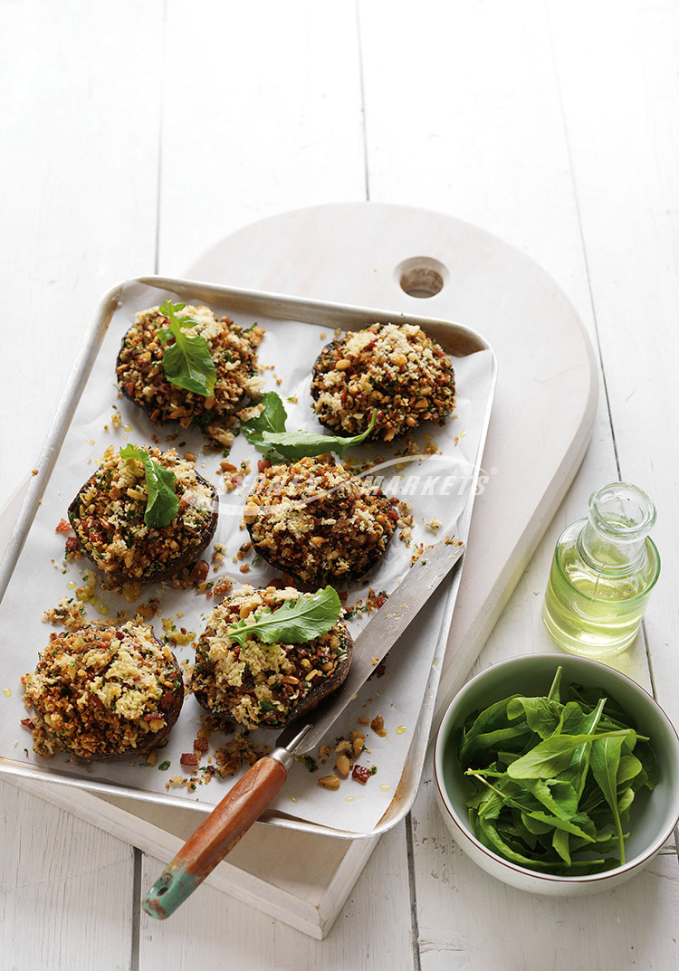 Step 2 Preheat oven to 180°C/160°C fan-forced. Liberally spray mushrooms with oil. Place on a baking tray lined with non-stick baking paper. Top each with breadcrumb mixture. Sprinkle with parmesan cheese. Bake for 15-20 minutes or until cheese melts and mushrooms are tender. Top with baby rocket leaves, drizzle with extra virgin olive oil and serve.