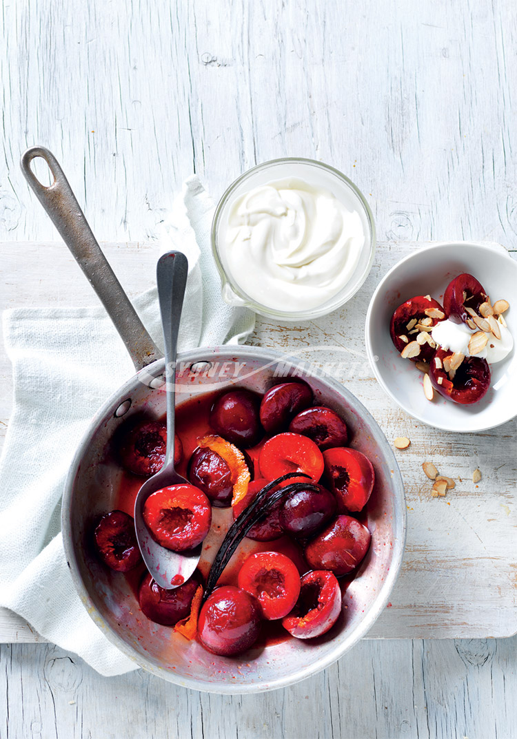 Step 1 Halve plums and remove stones. Combine maple syrup, orange juice, zest and vanilla bean in a medium frying pan over medium heat. Bring to the boil. Add plums and cook, tossing occasionally, 2-3 minutes or until warmed through. Remove from heat and set aside to cool slightly.