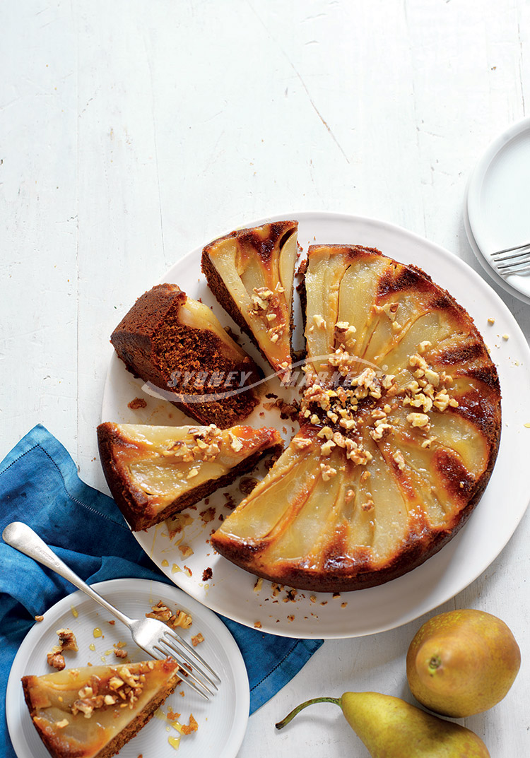 Step 5 Spoon over pears and smooth top. Bake for 1 hour 15 minutes or until cooked when tested with a skewer in the centre. Stand in pan for 10 minutes then turn out onto a wire rack to cool. To serve, sprinkle with walnuts and drizzle with maple syrup. Slice and serve warm or at room temperature.