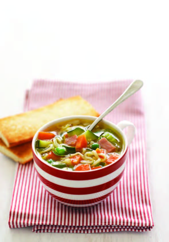 Step 3 Meanwhile, roughly break up dried noodles and cook, following packet directions. Drain. Add noodles to soup. Ladle soup into serving cups or bowls and serve with wholegrain toast.