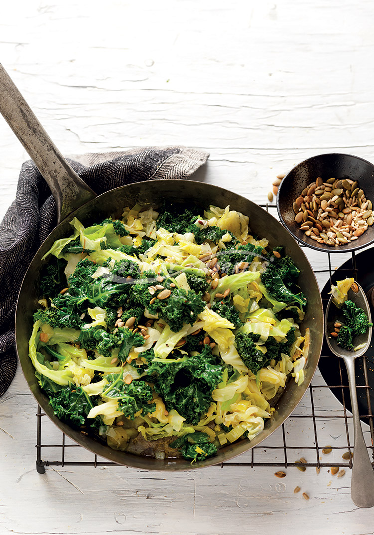 Step 2 Add kale and cabbage and cook, tossing occasionally, for 3 minutes. Stir in stock. Season with salt and pepper. Cover and cook, tossing often, for 4-5 minutes until kale leaves are tender. Sprinkle with toasted mixed seeds and serve.