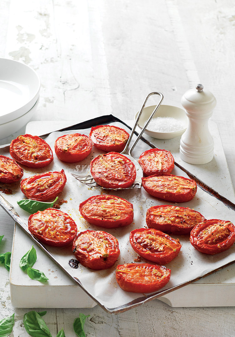 These tomatoes are best served at room temperature. Cook in advance and store layered between sheets of baking paper in an airtight container. Keep in the fridge and use within 1 week.