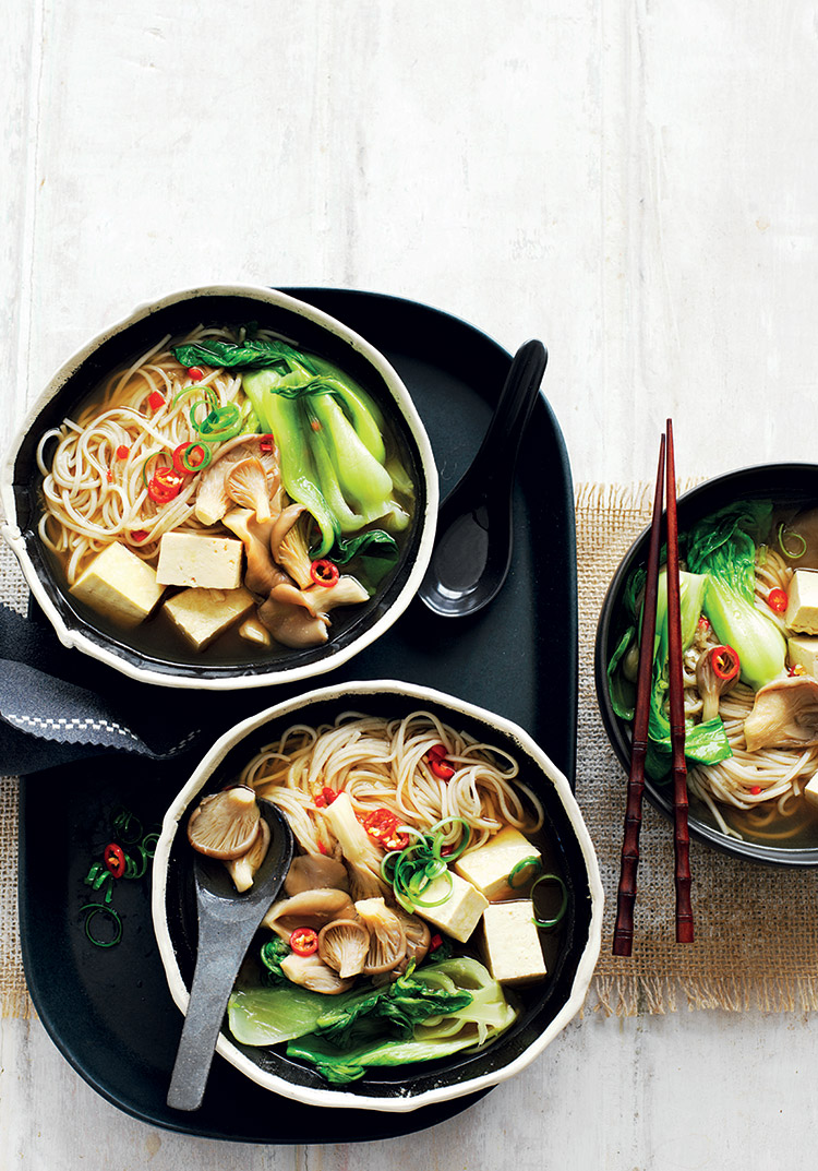 Step 3 Ladle bok choy, mushrooms and tofu over noodles. Stir sesame oil, soy sauce and lime juice into the hot stock mixture. Ladle soup into serving bowls. Top with chilli and green onions and serve.