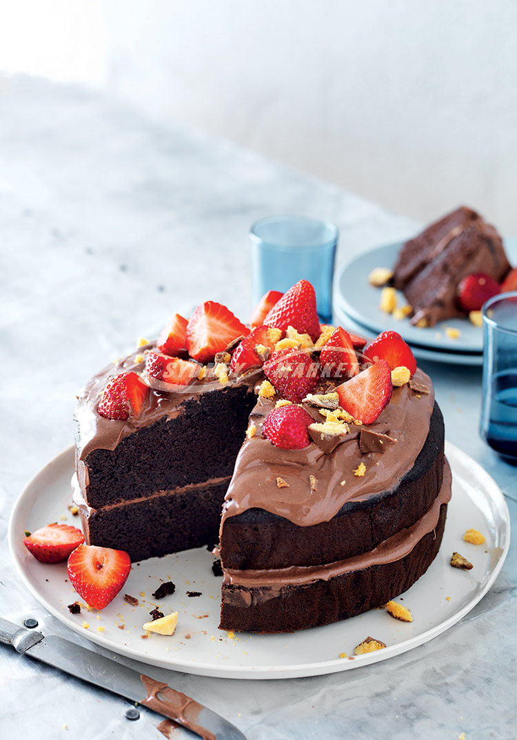 Step 4 To serve, place one cake onto a serving plate. Top with frosting. Add remaining cake. Top with frosting. Scatter with strawberries. Sprinkle with a small chopped honeycomb chocolate bar, if liked.