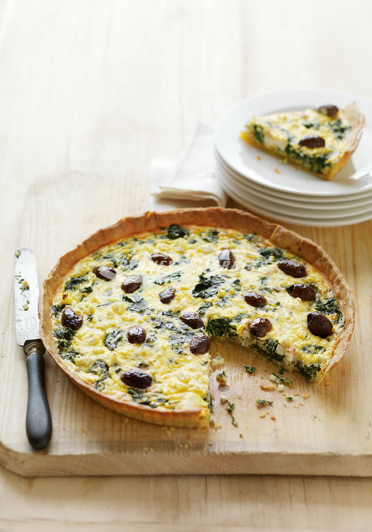 Step 4 Whisk eggs, cream and salt and pepper in a jug until combined. Pour evenly over spinach. Sprinkle with olives and feta. Bake for 25–30 minutes until set. Cool in pan for 5 minutes, then remove from pan and serve.