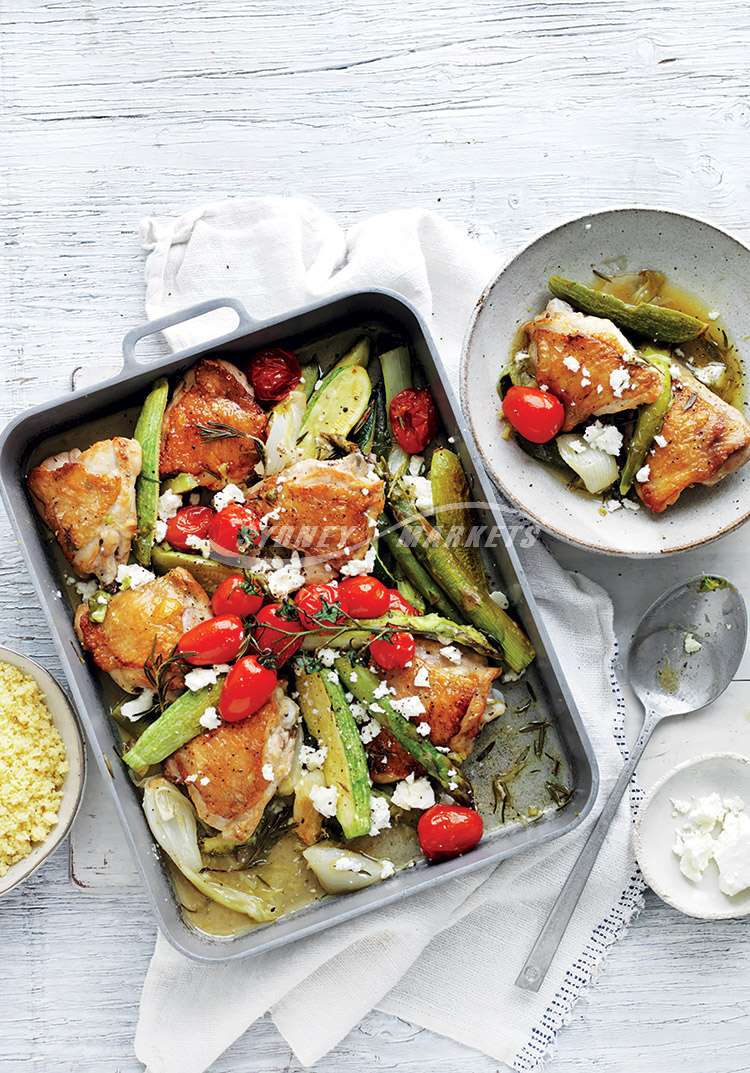 Step 3 Arrange chicken in pan. Roast for 15 minutes. Gently toss vegetables then roast for a further 10 minutes. Brush tomatoes with oil and add to pan. Roast for 8-10 minutes or until chicken is just cooked through and vegetables are tender. Sprinkle with feta and season with pepper. Serve with couscous.