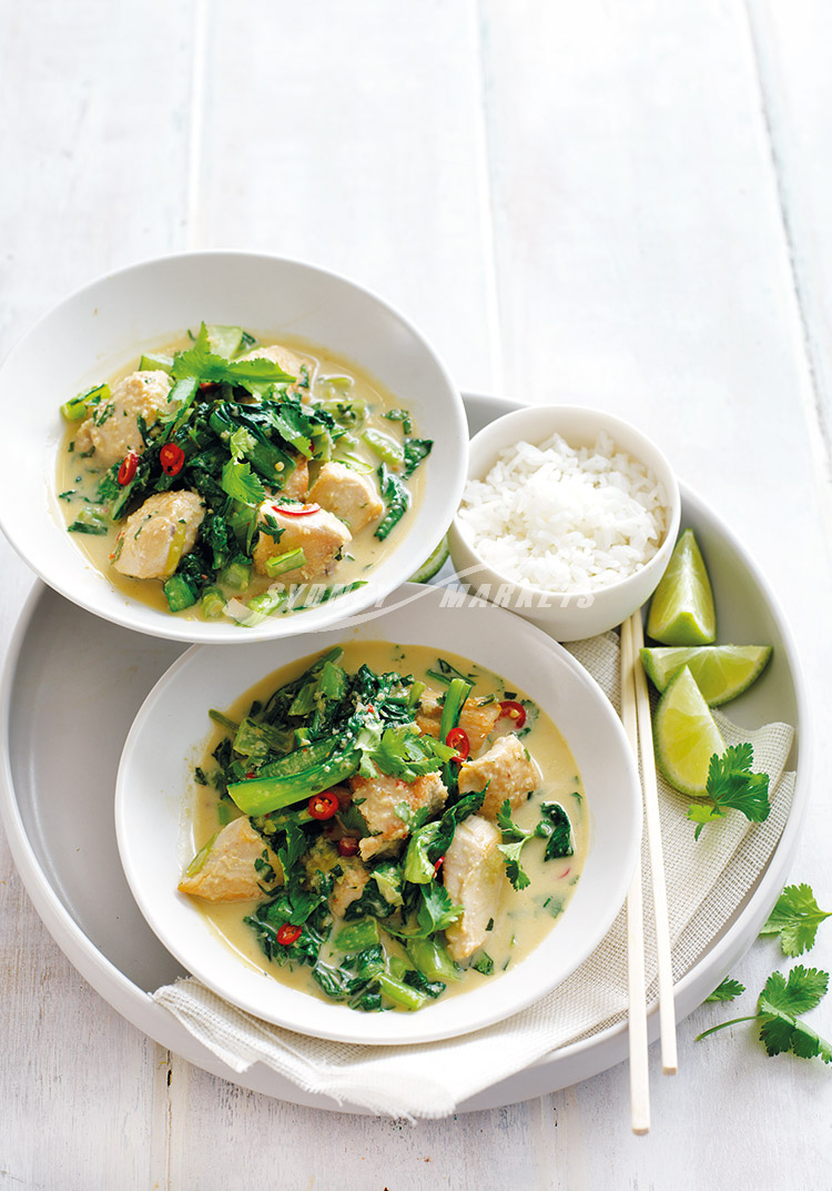 Step 3 Heat remaining 1 tbs oil in wok. Add green onions and Thai stir-fry paste and cook for 1 minute or until fragrant. Add coconut cream, fish sauce and chicken. Stir-fry for 2-3 minutes until hot. Toss through bok choy and choy sum, cover and cook for 1-2 minutes or until greens just wilt. Toss through coriander and serve with steamed jasmine rice.