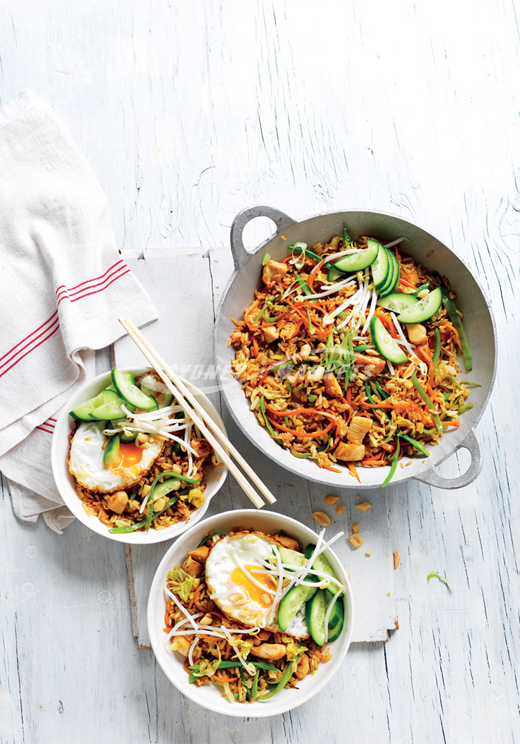 Step 3 Toss through rice, kecap manis and soy sauce and stir-fry for 2-3 minutes until hot. Divide rice mixture among serving bowls. Top each with bean sprouts, a fried egg, cucumber and a scattering of peanuts (if liked).