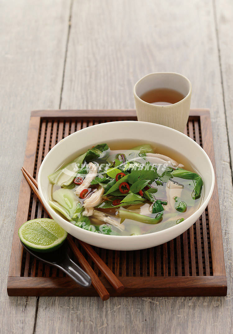 cup coriander and stir through soup.Step 3 Thinly slice chicken. Divide chicken among serving bowls. Ladle boiling soup and bok choy over chicken. Top with remaining coriander. Serve with lime wedges and sliced red chilli.